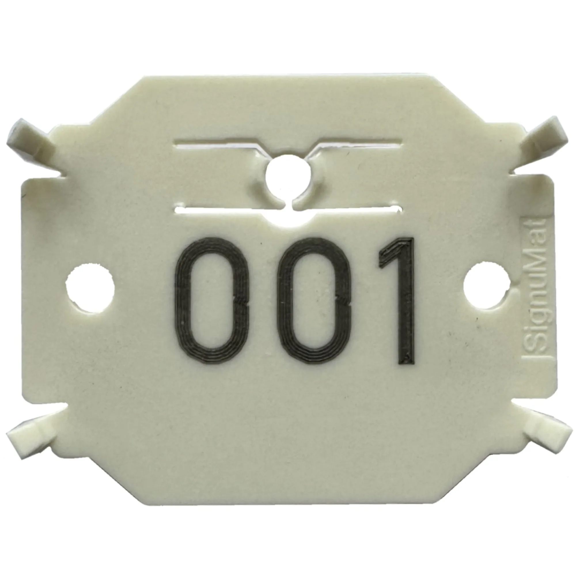 Durable tree tags with laser-engraved sequential numbers. Packed in stacks of 40 for easy loading into the ArboTag Storage Magazine. Includes nails. White plate with Black numbers.